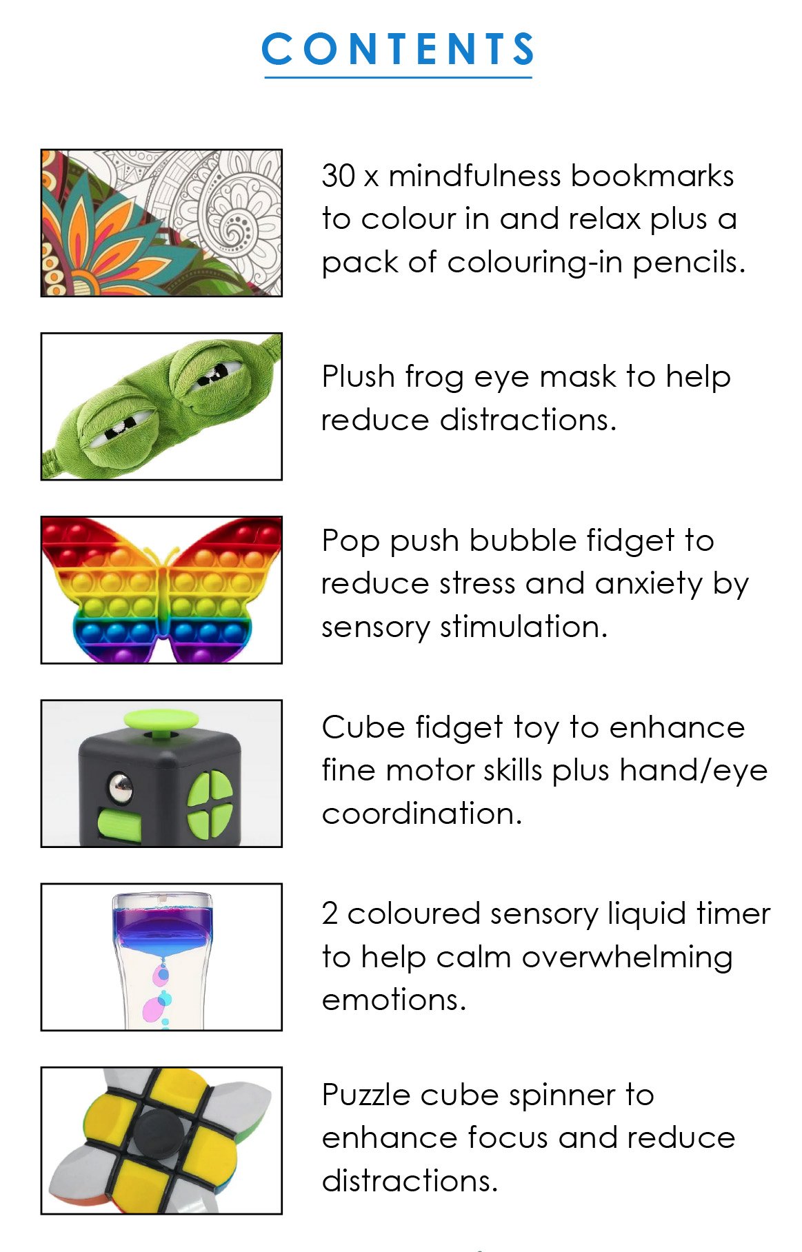 • A 2 coloured sensory liquid timer to help calm overwhelming emotions